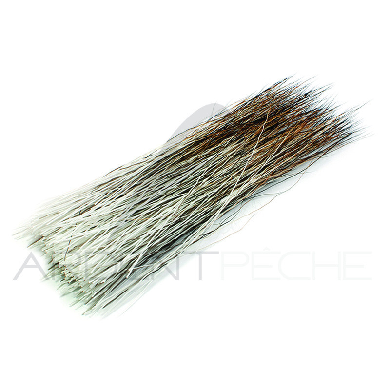 De longs poils pour vos imitations : Ailes et queues en sèches. Les poils noirs et blancs peuvent être utilisés pour représenter le corps des moustiques, les ailes de sedges.