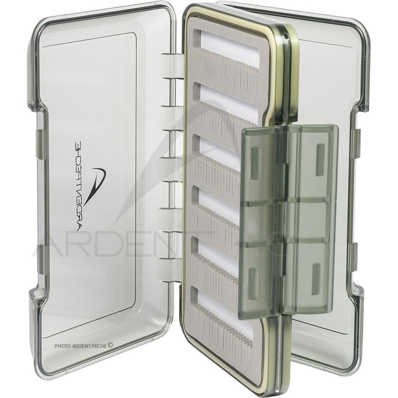 Boite à mouches pour petites, moyennes et grosses mouches. Se glisse facilement dans la poche de votre gilet. Ouverture très facile par simple pression sur un clip.- 2 Couvercles transparents pour visualiser facilement le contenu de la boîte.