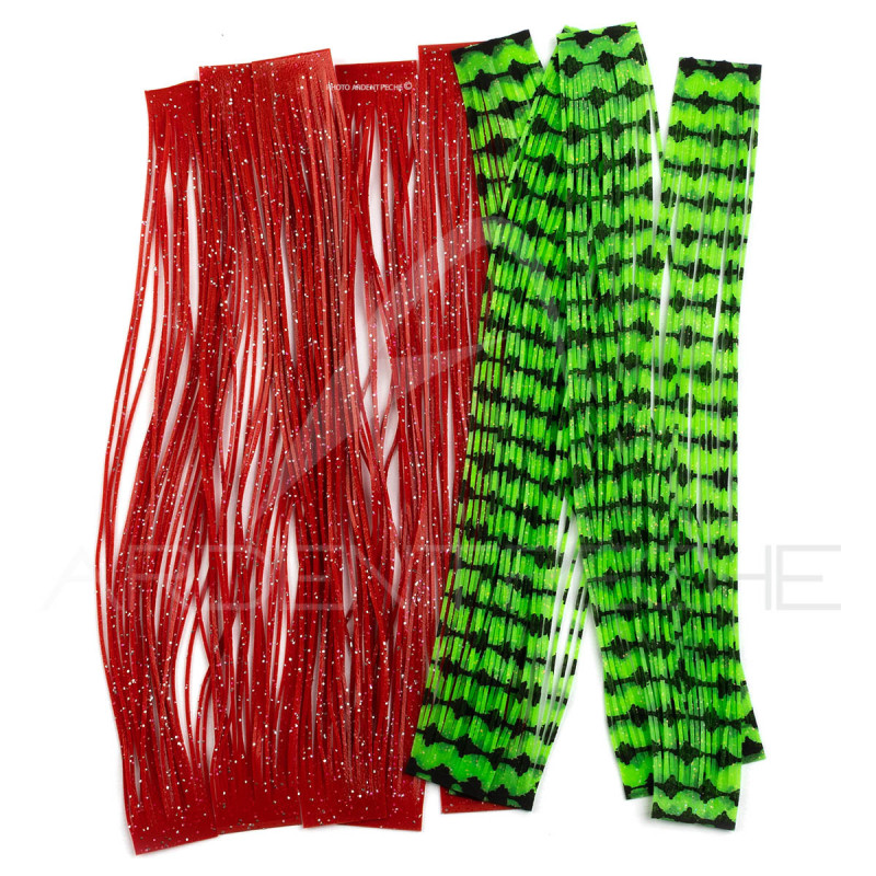 Petites bandes de plastiques souples pour imiter les pattes mouchetées des insectes terrestres.Peut-être utilisé pour les mouches mer et les pattes de poppers à black Bass.Sachet de 5 bandelettes contenant 22 SiliLegs chacune. - Longueur 14 cm