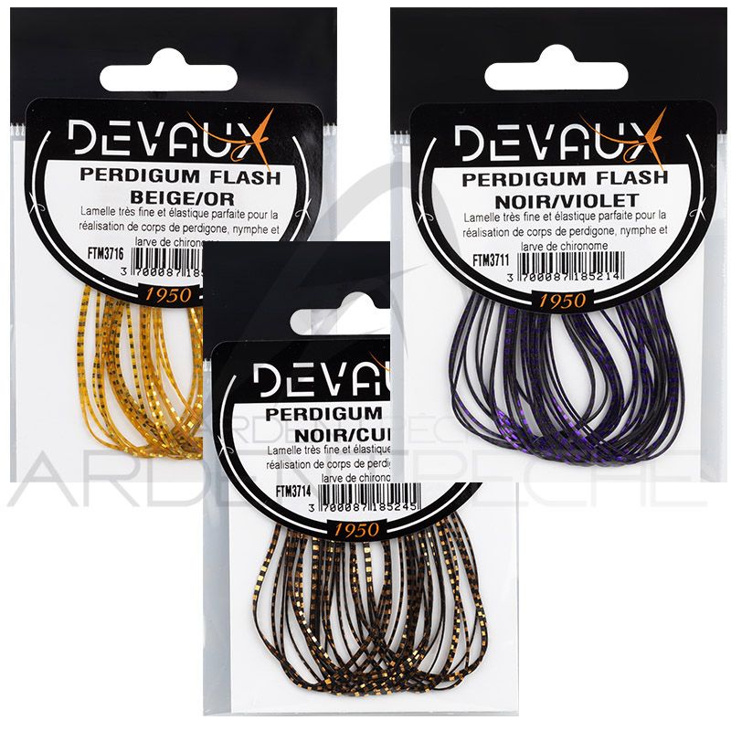 Le perdigum est un matériau innovant destiné aux monteurs de mouches recherchant à la fois éclat, solidité et réalisme. Il est particulièrement apprécié pour le montage des perdigones, des nymphes modernes et des imitations de larves de corégones. Présenté sous forme de bandes très fines, souples et extensibles, il se distingue par ses finitions marbrées et métalliques qui apportent un rendu visuel très attractif sous l’eau. Il permet de créer des corps segmentés au style original et efficace.